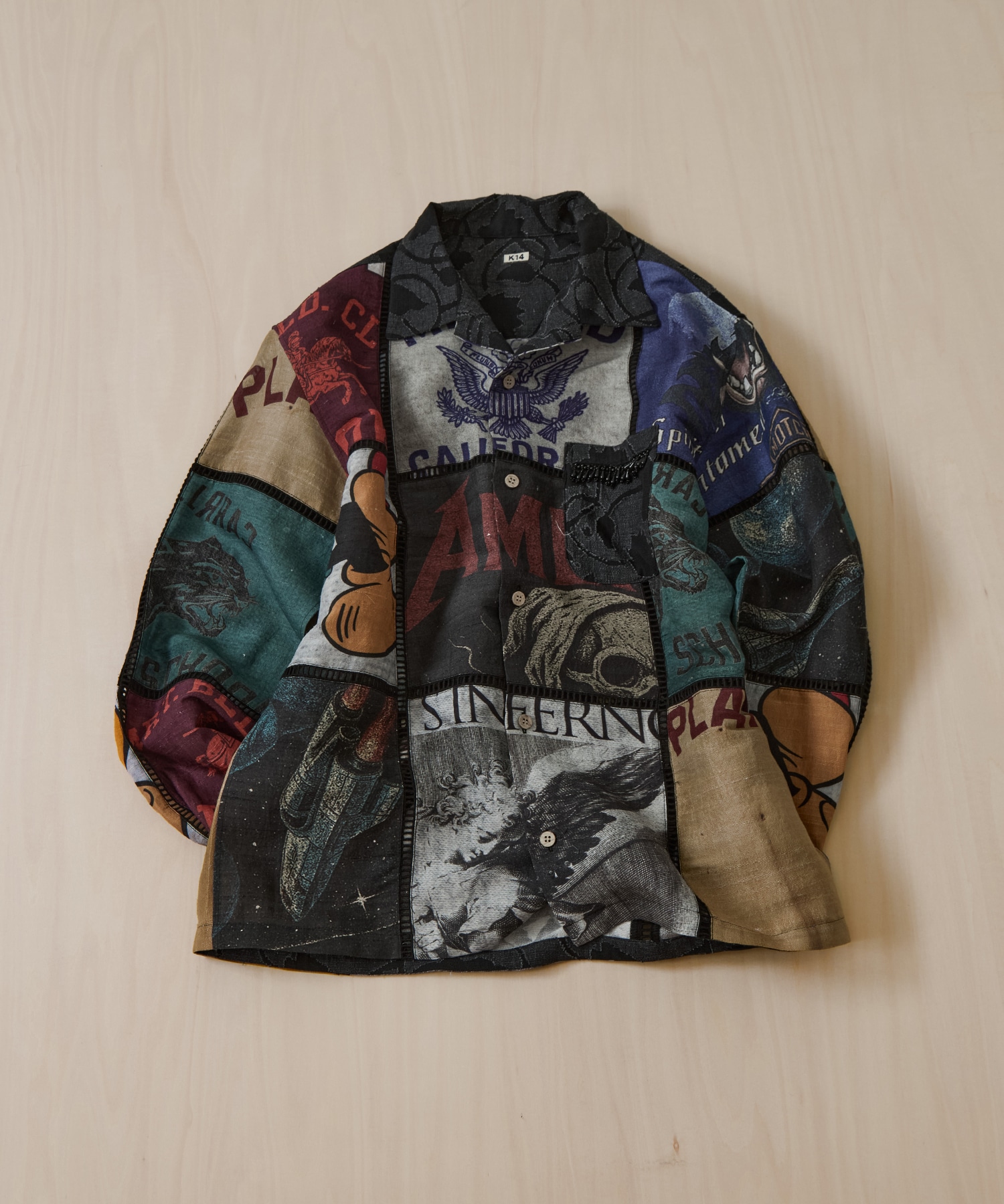 パッチワークならではのクラフト感がありながら、落ち着いたトーンでまとめることで、日常のスタイリングにも取り入れやすい一着です。