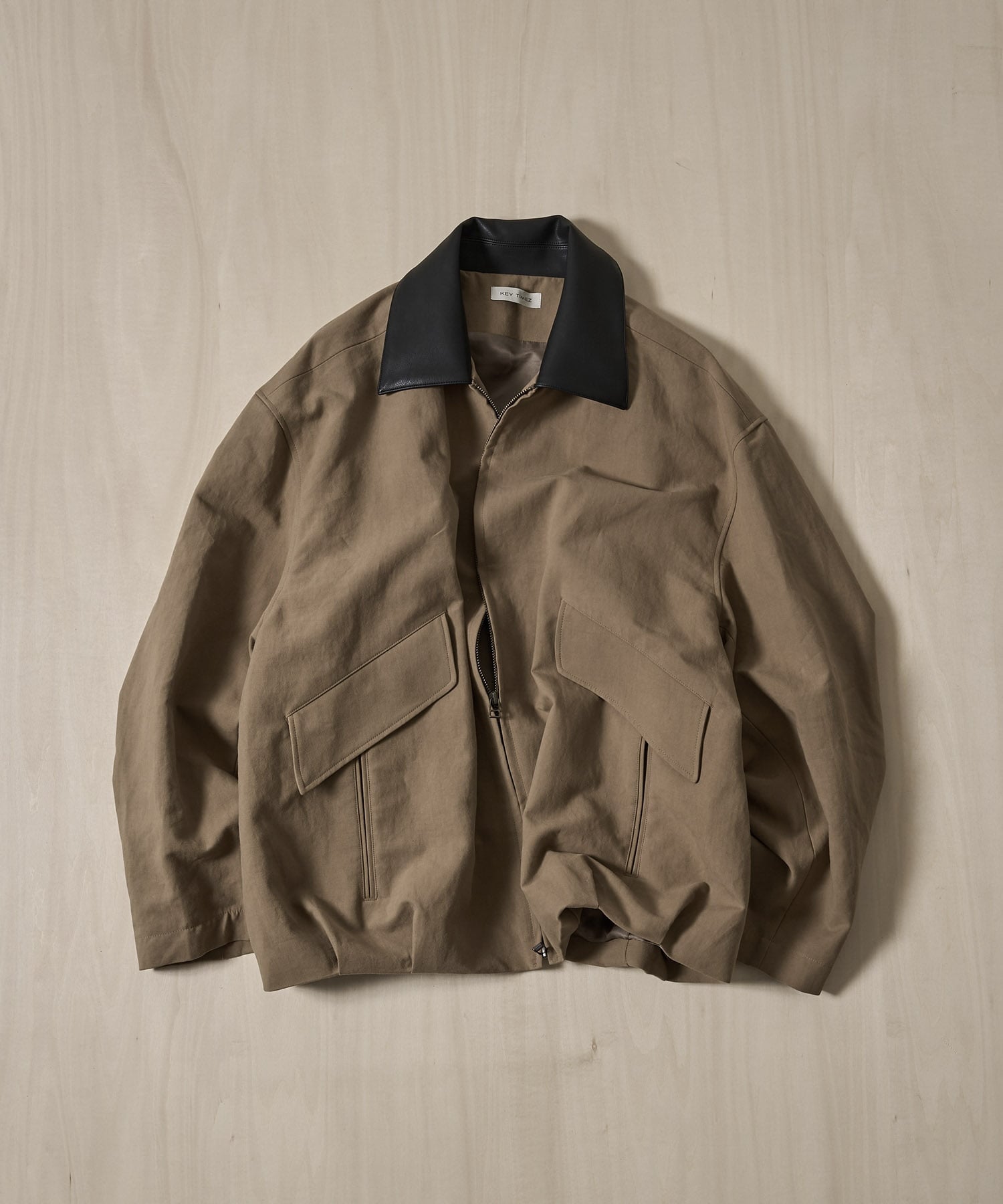 衿部分には、LEATER TEX社製の顔料コーティングフェイクレザーを採用。