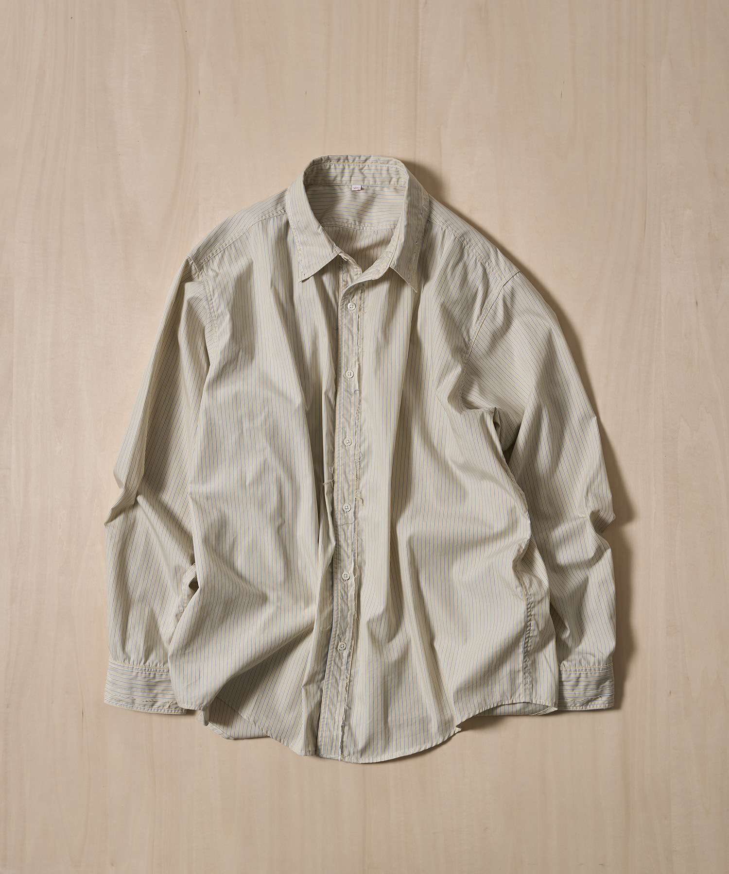 襟や前立て、袖口など要所にカットオフ加工を施した、表情豊かな長袖ストライプシャツ。