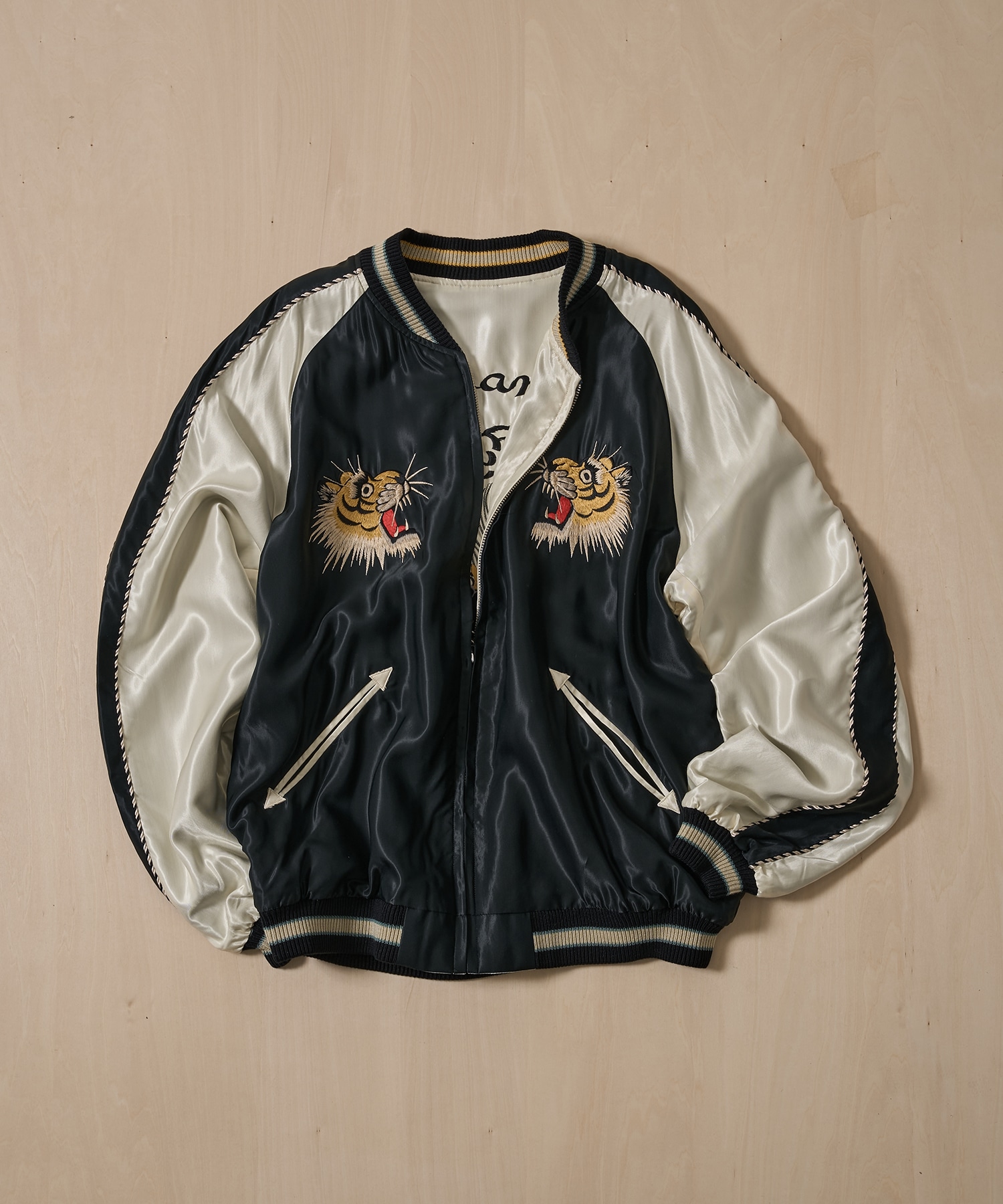 デザイン 表面はブラック×オフホワイトのモノトーン調ボディに、月夜に咆哮する虎を配した、「THE スカジャン」とも言える王道の絵柄。 1950年代中期の作品をベースに、刺繍の針足を巧みに使い分け、虎の毛並みや筋骨隆々とした体躯を写実的に表現しています。 黒いサテン生地に際立つコントラストの強い配色により、迫り来るような躍動感と迫力を備えた仕上がり。 背中の「JAPAN」ロゴは、ヴィンテージでも人気の高いオリエンタルなフォントを忠実に再現しています。 リバーシブル面には、長い胴体を雲間に隠しながら大空を浮遊する龍の絵柄を配置。 ブラックを基調とした単色刺繍ながら、顔や鱗の縁にグレーの色糸を重ねることで立体感を強調。 風になびく龍の鬣(たてがみ)は、細いラインの横振り刺繍で繊細に描写されています。 身頃より袖下の色味を濃くした、通称「逆配色」と呼ばれる仕様で、白いボディに黒い龍が際立つコントラストを演出します。 素材 スーベニアジャケットの中でも最もスタンダードな、両面にアセテート生地を使用したリバーシブルタイプ。 戦後当時のスカジャンには、シルクに似た高級感を持つ物資統制外品目としてアセテート素材が用いられていました。 中綿を入れていないため季節を問わず着用でき、アセテート特有の美しいドレープ感も魅力です。 ※店舗と在庫を共有しておりますので、受注確認メールが届いてもご注文のタイミングにより売り切れとなる場合がございます。予めご了承ください。