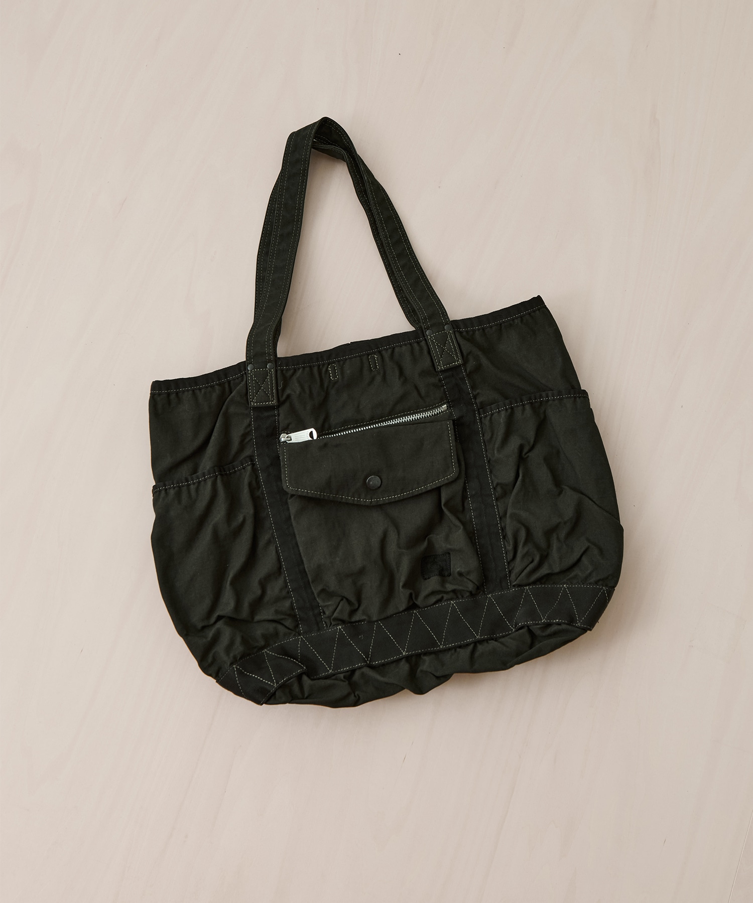 デザイン 見た目からは想像できない軽さと収納力の高さも魅力です。 各アイテムの外装には奥行きのあるカバンの形状を活かした大きなポケットを備え、収納物の出し入れをしやすくしています。 本体底部にジグザグのステッチがアクセントになったナイロンテープを施すことで、ハリ感のある生地とマッチして自立しやすい作りにしました。 A4サイズが収まる、普段使いに最適なトートバッグです。 ハンドルは肩掛けでも使用できるよう長めに設定。内装には二つの仕切りポケットを設け、外装ポケットと合わせて収納力に優れた整理しやすい実用的な作りとなっています。