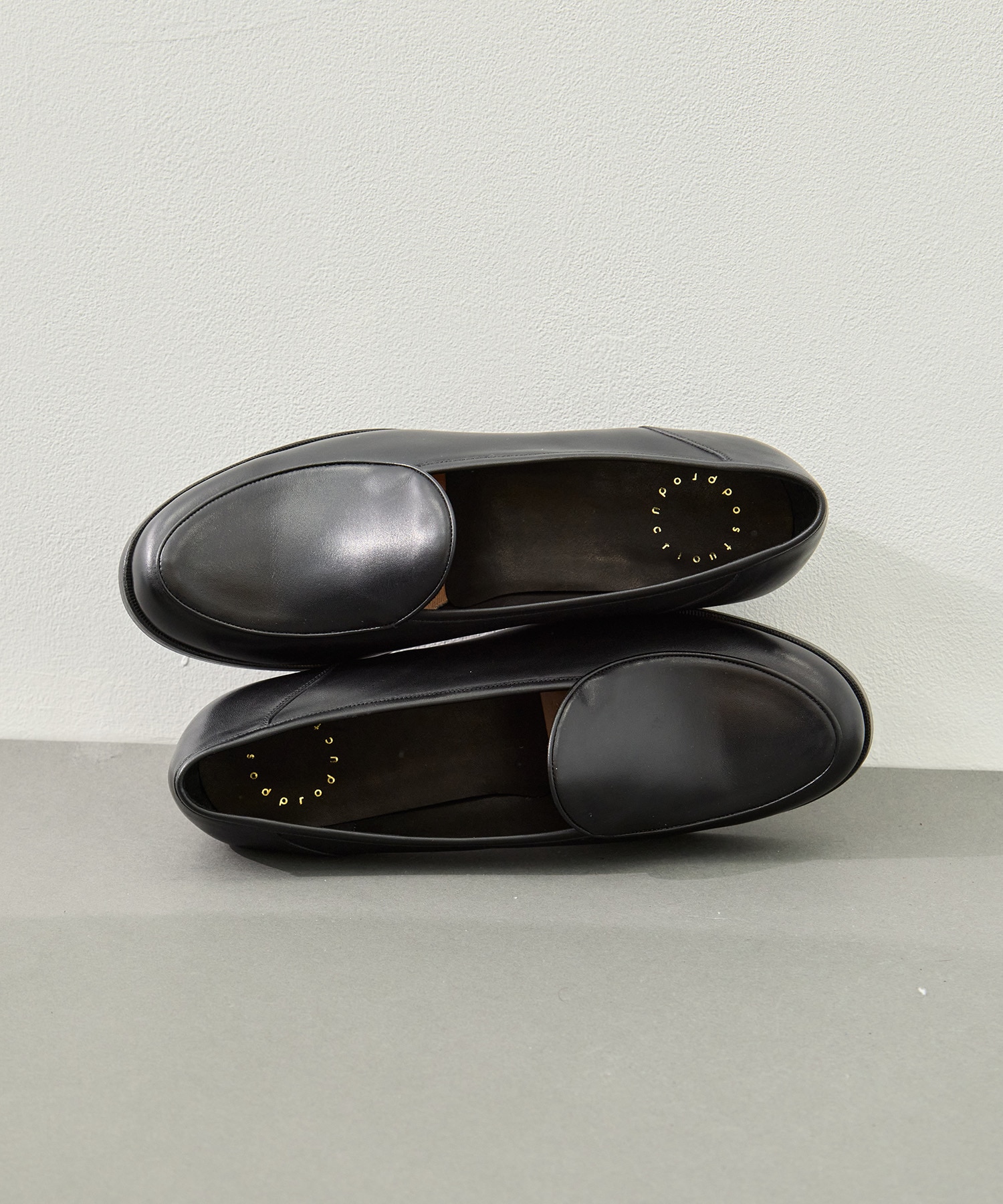Post Productionのコンセプトを体現した一足。 「玄関にこれ一足あれば、締まった足元を演出してくれる。」そんな一足にするために、このデザインを前提として木型開発からスタートしました。目指したのは、足入れのしやすい履き口広めのローファーでありながら、小走りでも踵の浮かないようなフィット感のある木型。甲は低く、踵に向かって狭くなっていく木型です。甲の高い方(二の甲の立ち上がりが大きい方)も、その部分にベロのデザイン線がこないのであまりストレスはありません。見た目には「“軽やかさ”と“頼もしさ”」を併せ持つバランスを目指しました。 ほのかな丸みのトゥ、2.5cmの少し高めに設定しテーパーをかけたヒール、かかとからトゥにかけて落差をつけた美しい直線が、端正な表情の中にも色気を加えます。そしてモカと履き口部分には丁寧にパイピングとテープを施し、上品な印象に仕上がげています。前から見ればほどよくカジュアルに丸く、横と後ろ姿は少しセクシーに。あらゆる人に寄り添う一足です。サイズ4h(23.5-24cm)5 (24.5-25cm)5 1/2 (25.5-26.0cm)6 (26.5-27cm)6 1/2 (27-27.5cm)-Post Production-ローファーを中心とした革靴と革小物を展開する日本のレザーブランド。「製品が人の手に渡る、その先の美しさを。」をコンセプトに掲げ、製品そのもののクオリティはもちろん、手にしたその先の風景までを見据えたものづくりを行っています。“作りの良いもの”が珍しくなくなった現代において、その先にある価値まで追求するプロダクトを提案しています。※店舗と在庫を共有しておりますので、受注確認メールが届いてもご注文のタイミングにより売り切れとなる場合がございます。予めご了承ください。