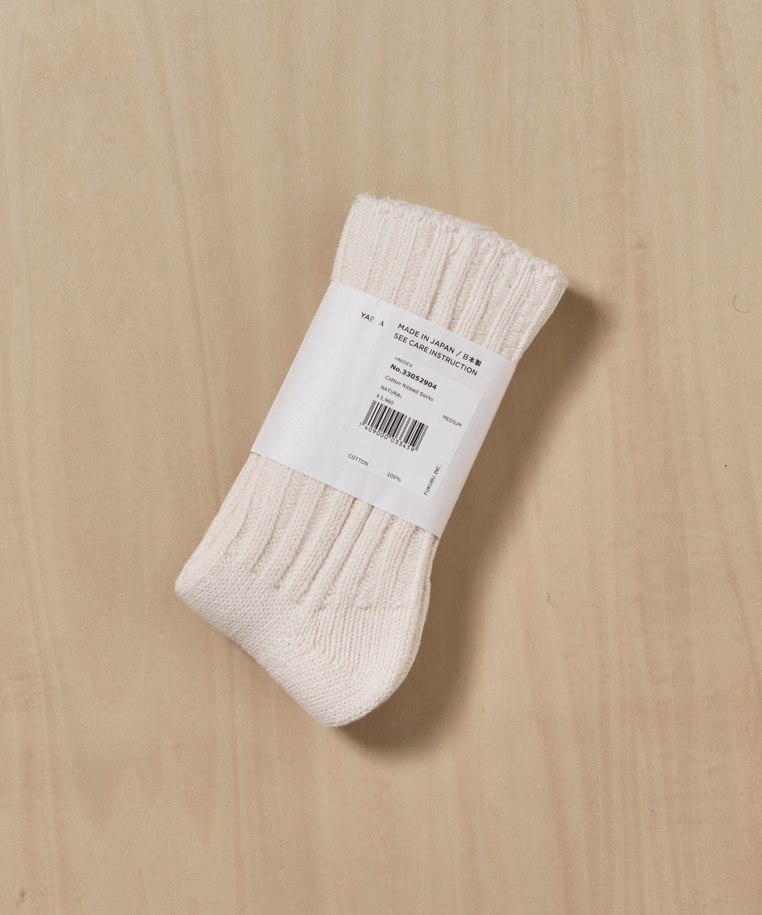 まるでウールのような柔らかな肌触りのコットン糸を使用した、YAECA定番のリブ編みソックス。