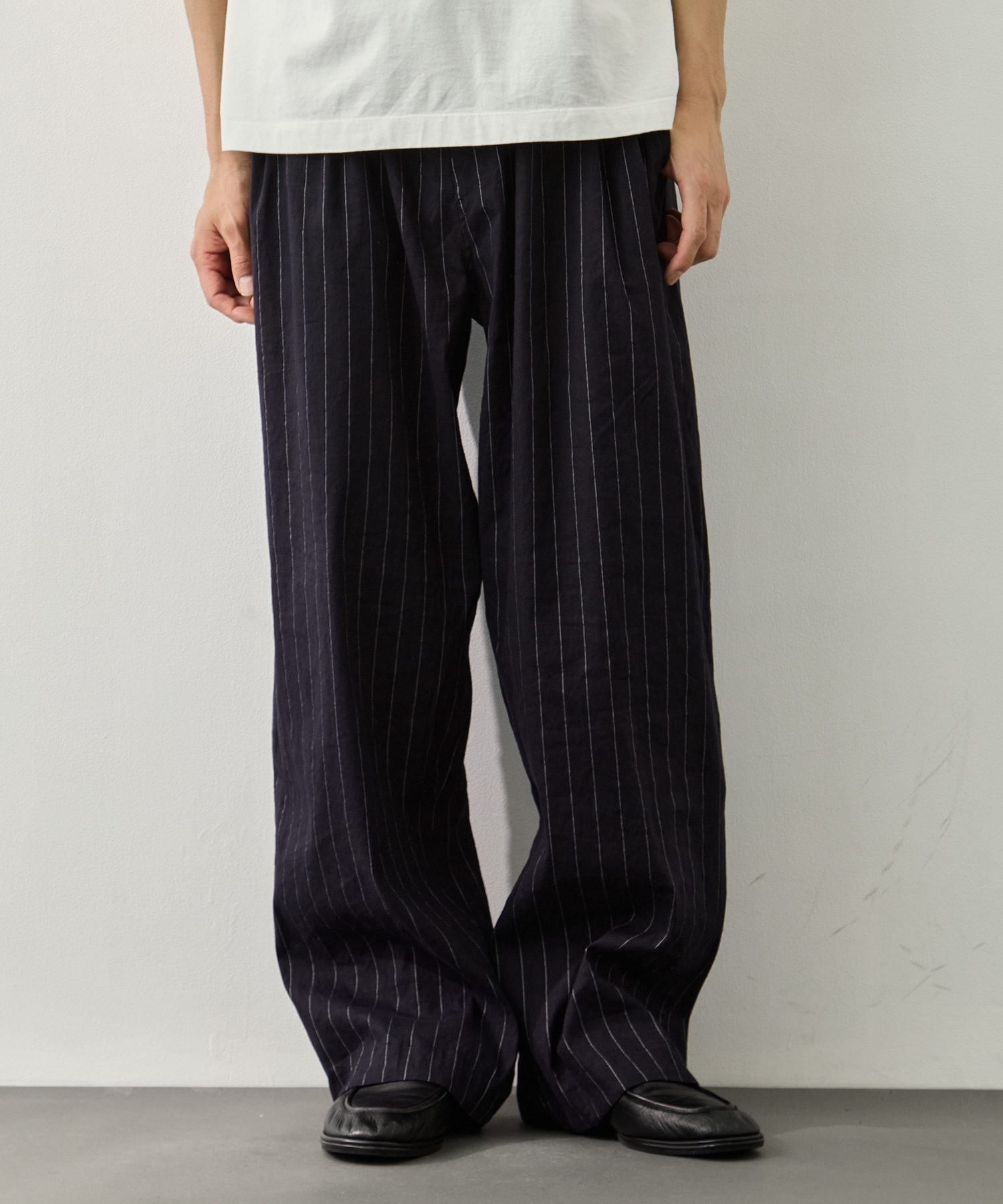デザイン 道着や袴を彷彿とさせる、新作のビッグワイドパンツ。 大きく取られたウエストをドローコードで絞ることで、美しいギャザーが生まれ、体型を問わず着用可能な設計です。 長めに設定されたドローコードと先端のカンヌキが、ミニマルな中にさりげないアクセントをプラス。 リラックス感がありながらも、上品で都会的な印象を併せ持つ一本です。 素材 リネン58% / レーヨン39% / ポリウレタン3% リネンとヴィスコースを交織した軽やかな布帛素材を使用。 バイオウォッシュによる柔らかな風合いと、ヴィスコース特有の美しい落ち感が特徴です。 ストレッチ性も備え、動きにしなやかにフィットする快適な穿き心地を実現しています。 日本製 品番:_253 -UNTRACE- 「機能と実用の検証」をテーマにしたブランド。 時代によって変化する衣食住における機能性を見つめ直し、アップデートすることで新たな価値を提案しています。 ※店舗と在庫を共有しておりますので、受注確認メールが届いてもご注文のタイミングにより売り切れとなる場合がございます。予めご了承ください。