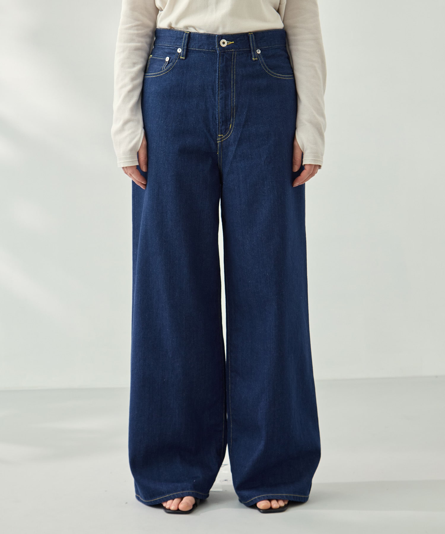 デザイン 身体のラインを拾いにくいワイドシルエット。 ミッドライズ設計で腰まわりをすっきりと見せ、上品でクリーンな印象に仕上げたバギーパンツです。 ※サイズアップでよりバギー感をお楽しみいただけます。 白耳セルビッチデニムを使用し、デニムの産地として名高い岡山で丁寧につくり上げました。 裾をロールアップした際にも端まで美しい表情が際立ちます。 きれいめな佇まいを保ちながら、ほどよくカジュアルなスタイリングも楽しめる一本です。 素材 旧式シャトル織機で、時間をかけて織り上げた白耳セルビッチデニム。 セルビッチとは、生地の端まで一続きに織り上げる伝統製法のこと。高速織機では再現できない、密度のある織りと均整の取れた表情が特徴です。 効率よりも質を優先した、丁寧なものづくりの証でもあります。 経糸にはロープ染色を施し、着込むほどに美しく色が変化する、デニムならではの経年変化を楽しめる仕様。 ヴィンテージの趣を感じさせながらも、大人が品よく取り入れられる一素材です。 ※店舗と在庫を共有しておりますので、受注確認メールが届いてもご注文のタイミングによりましては売り切れになる可能性がございますので、予めご了承ください。 ※商品の色味につきまして、撮影環境、お客様のお使いのPCのモニター環境により実際のカラーと画像の色味が違って見える場合が御座います。