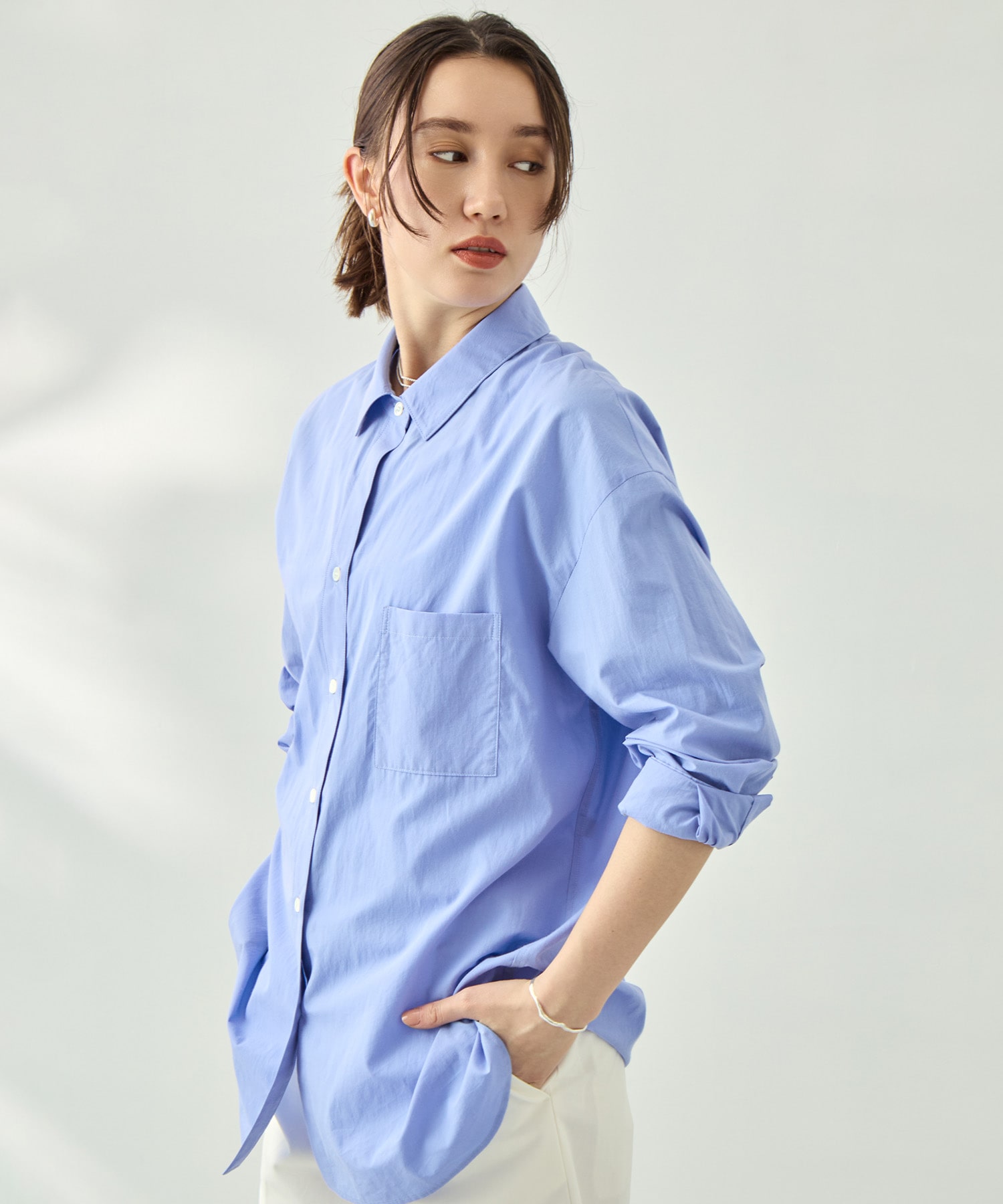 デザイン 一枚でも、ジャケットのインナーとしても様になるベーシックシャツ。 程よくゆとりを持たせた袖は、袖口にかけて緩やかにすぼめることで、シンプルながらも立体感のあるシルエットに仕上げています。 また、あえて第二ボタンを省くことで、自然と抜け感のある衿元を演出。 ベーシックでありながら、さりげない設計で差がつく一枚です。 素材 たてよこに細番手の糸を使用した、軽やかな平織り素材。 さらりとしたなめらかな肌触りと、程よいハリコシを兼ね備え、清潔感のある表情に仕上げています。 軽くしなやかな風合いで、肌離れも良く、着用時のストレスを感じにくいのも特徴。 まるで肌着のように心地よく、一日中快適に過ごせる素材です。 ※店舗と在庫を共有しておりますので、受注確認メールが届いてもご注文のタイミングによりましては売り切れになる可能性がございますので、予めご了承ください。 ※商品の色味につきまして、撮影環境、お客様のお使いのPCのモニター環境により実際のカラーと画像の色味が違って見える場合が御座います。